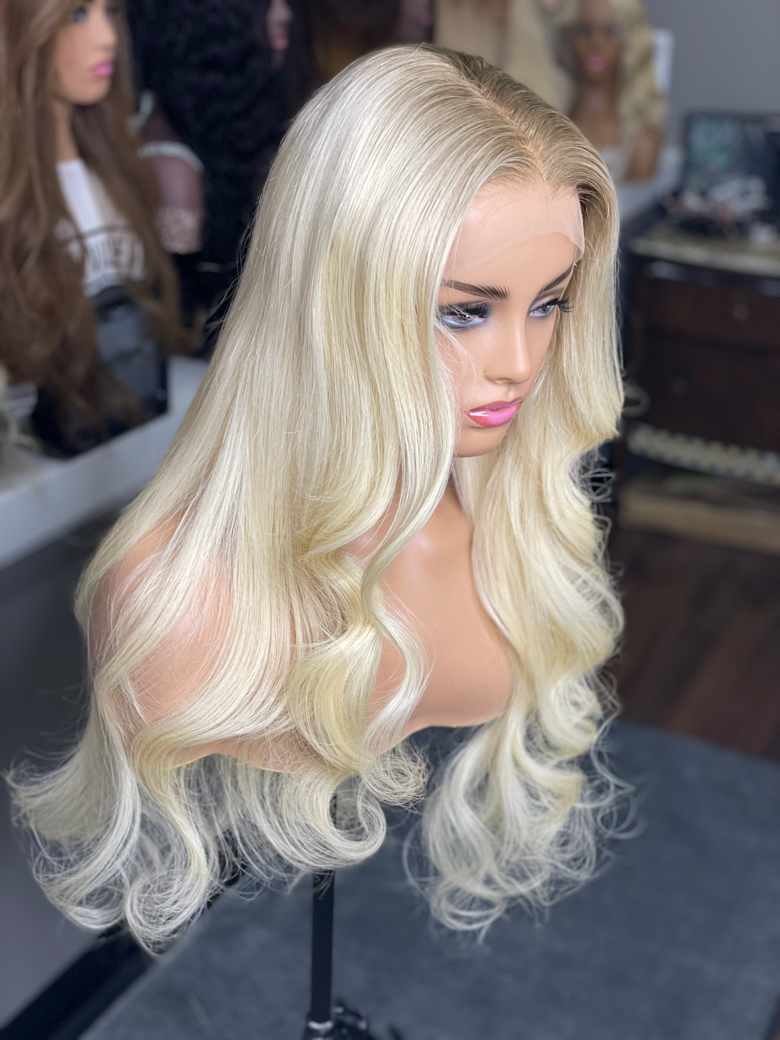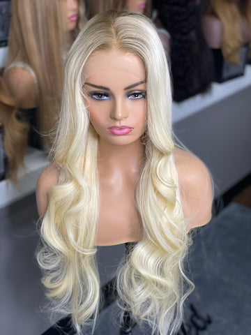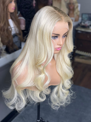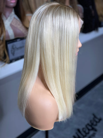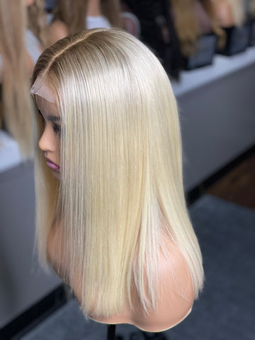 *14” Blonde with ash brown roots Glueless Frontal Lace wig